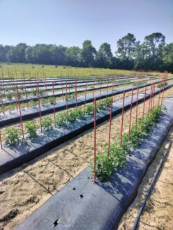 In the two-year study, researchers applied five rates of biochar (0,5,10,15, and 20 tons/acre), sourced from pine wood chips, as a one-time surface amendment prior to the first plasticulture tomato growing season. The target nitrogen rate application from both fertilizer sources was 225 pounds per acre. The synthetic fertilizer treatment involved a pre-plant application providing 50 pounds of nitrogen per acre with the remaining 175 pounds applied evenly in 10 weekly fertigation events through a drip system. The full poultry litter rate was applied pre-plant in accordance with USDA guidelines for food safety.