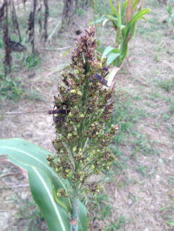 • Leaffooted bugs are visually attracted to the large head of Peredovik sunflower and the sorghum panicles in milk stage. Leaffooted bugs feed and oviposit on the trap crops, making the system very successful. Leaffooted bugs may be present on sorghum heads even in the late season providing long-term benefits to late-planted tomatoes (sunflowers bloom and mature quickly losing their attractiveness). NK-300 sorghum also does well under drought conditions, although plants may be stunted.