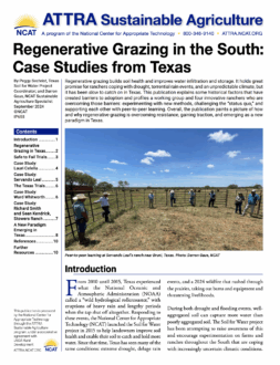 This publication explains historical factors that have created barriers to adoption and profiles a working group and four innovative ranchers who are overcoming those barriers: experimenting with new methods, challenging the status quo, and supporting each other with peer-to-peer learning. Overall, the publication paints a picture of how and why regenerative grazing is overcoming resistance, gaining traction, and emerging as a new paradigm in Texas.